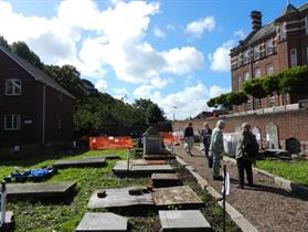 Exeter Dissenters' Graveyard belonged to George's Meeting until the 1980s, when it was sold to the first of several hopeful developers. The last of these, though interested in building social housing, was also sympathetic to preservation. He challenged local people to come up with a funded renovation plan. The challenge was met and thanks to a generous anonymous donation the site was purchased by Exeter Historic Buildings Trust (EHBT) to be passed on to the newly formed Exeter Dissenters Graveyard Trust (EDGT) when formally incorporated as a charity. Grants have been awarded of £1,000 from the Council for British Archaeology and £7,900 by the Heritage Lottery Fund, and there have been generous private donations as well as those from EHBT, Exeter Civic Society, St Leonard’s Neighbourhood Association and Devon Gardens Trust, which have enabled a start on Phase 1 of the project: clearance and investigation of the site.